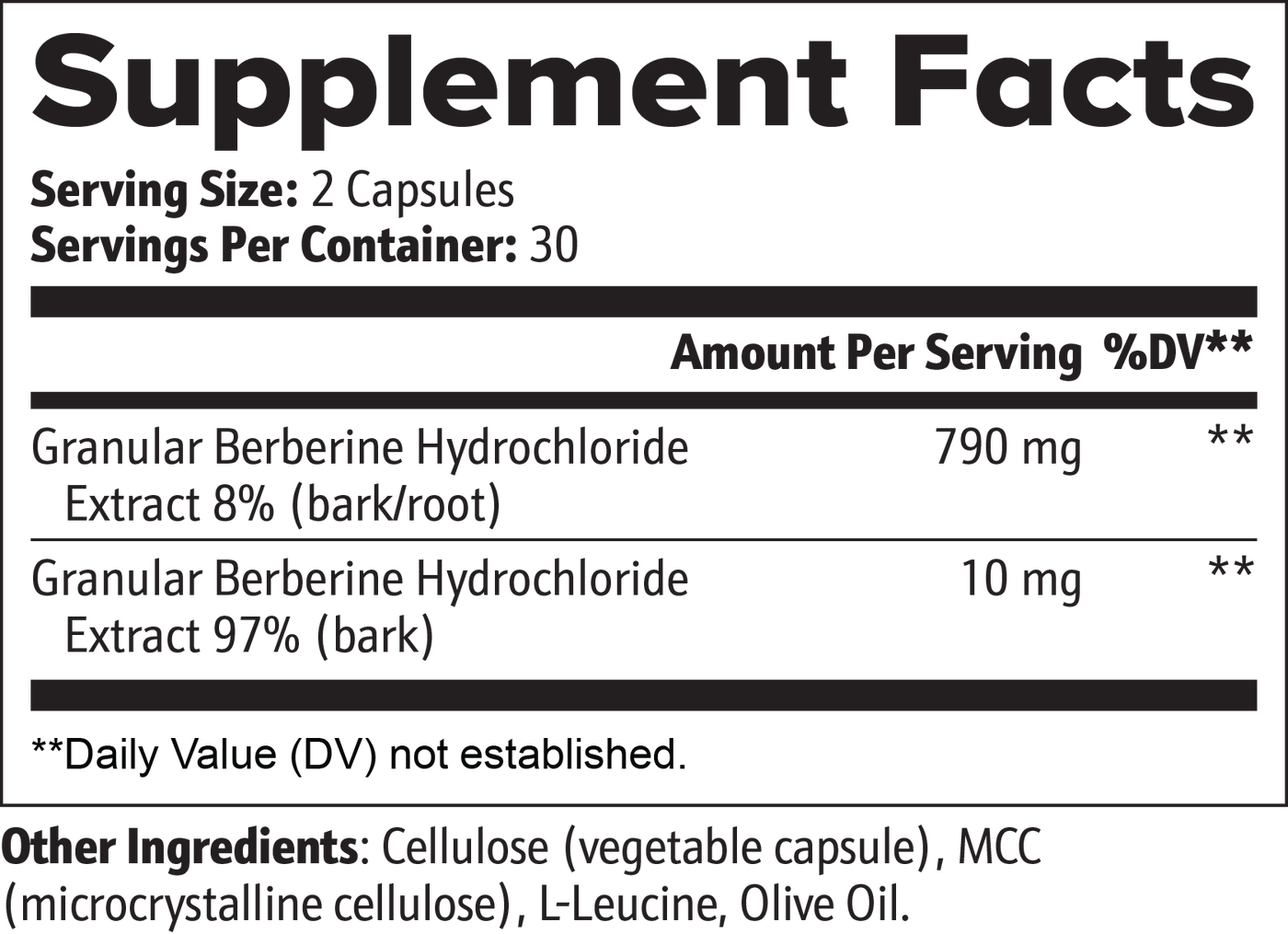 Ingredients: Granular Berberine Hydrochloride Extract 97% (bark), Granular Berberine Hydrochloride Extract 8% (bark/root), Cellulose (vegetable capsule), MCC (microcrystalline cellulose), L-Leucine, Olive Oil.